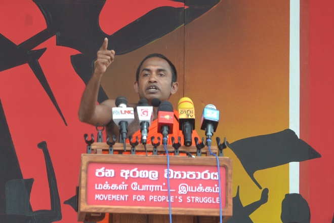 “අපි කියනවා, ආණ්ඩු මට්ටු කරන බලයක් දියවන්නාවෙන් එලියේ හදන්න ඕන. ඒක තමයි ජන අරගල ව්යාපාරයේ න්යාය පත්රය. අපි හෙටත් පෝලිම්වල ඉඳගෙන ආණ්ඩුවට දෙස් දෙවොල් තියනවද? දෙස් දෙවොල් තිය තිය හූල්ල හූල්ල හිටියොත් අපි පරාදයි. රාජ්ය, අර්ධ රාජ්ය, පෞද්ගලික, වතු කම්කරුවන් වැටුප් සටනකට ලෑස්ති වෙන්න ඕන. ගොවීන්, ධීවරයන්, ස්වයං රැකියා කරන්නන් ඇතුළු සියලු දෙනා සහන ඉල්ලන්න ඕන. මූල්ය අරමුදලේ කොන්දේසි ක්රියාත්මක කිරීමට විරුද්ධව සටන් කරන්න බලයක් ගොඩනගන්න ඕන. ඉන්දියාව, චීනය, ඇමරිකාව එක්ක අත්සන් කරන ආරක්ෂක ගිවිසුම්වල බලපෑම ඉදිරියට එනවා. ඒ නිසා ජනතාව සංවිධානය වෙන්න ඕන. මේ දිශාවට වැඩ කරන්න ඕන. මේ අරගලය තුළ තමයි ආණ්ඩුවේ ජනතා විරෝධී තීන්දු ආපස්සට හරවන්න, ජනතාව මත පීඩාකාරි මිල වැඩි කිරීම්, බදු, නීති සහ නියෝග පටවන ආණ්ඩුව මට්ටු කරන්න, පාලකයන් ගෙදර යවන්න විතරක් නෙවෙයි, ජනතාවගේ අරමුණු ඉටු කරගන්න සමත් පාලනයක් වෙනුවෙන් ජනතා බලය සංවිධානය කරන්න ‘ජන අරගල ව්යාපාරය’ තවතවත් ශක්තිමත් කරමු, ඒ වෙනුවෙන් ඒකරාශි වෙමු.”