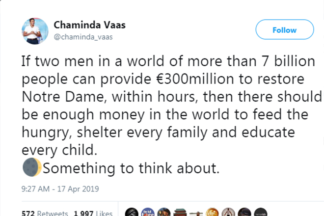 පසුගියදා පැරිසියේ නොත්රදාම් දේවස්ථානයේ විශාල කොටසක් ගින්නකින් විනාශයට පත් වීමෙන් පසු එය යළි ගොඩ නැගීම සඳහා අවශ්යවන එම යුරෝ මිලියන 300 පැය කිහිපයක් ඇතුළත පරිත්යාග කළ හැකි විය. තත්වය එසේ නම්, ඔවුන්ට ලෝකයේ දරිද්රතාවයෙන් පෙළෙන, හිසට සෙවණක් නැති ජනතාව වෙනුවෙන් ඉදිරිපත් වීමට ඇති තරම් ධනය ඇති බව ශ්රී ලංකා ක්රිකට් පිලේ හිටපු වේග පන්දු යවන ක්රීඩක චමින්ද වාස්, සිය ට්ටිටර් ගිණුම හරහා සටහනක් තබන ලදී.