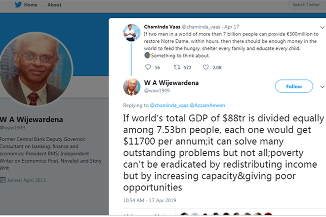 ගිනිගෙන විනාශ වූ නොත්රදාම් දේවස්ථානයේ (Notre Dame) පිළිසකරකිරීම් සදහා ප්රකෝටිපතියන් දෙදෙනෙකුට යුරෝ මිලියන 300ක් දිය හැකි නම් ලෝකයේ දිළිදුකම තුරන්කිරීමට නොහැකි මන්දැයි ක්රිකට් ක්රීඩක චමින්ද වාස් ප්රශ්න කර සිටි අතර මහබැංකුවේ හිටපු නියෝජ්ය අධිපති විජේවර්ධන එයට පිළිතුරු ලෙස පවසා ඇත්තේ මුදල් බෙදීමෙන් දිළීදුකම තුරන් කළ නොහැකි බවය.