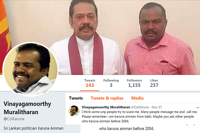 එල්ටීටීඊ සංවිධානයේ සන්නද්ධ නායකයකුව සිට ප්රබාකරන් සමග ඇති වූ ආරවුලකින් පසුව වෙන්ව පසුව ආණ්ඩුවේ සහායට පැමිණි ඔහු ඔහු සිය නිල ට්විටර් ගිණුමේ තබා ඇති පණිවුඩයක් මෙසේය.
