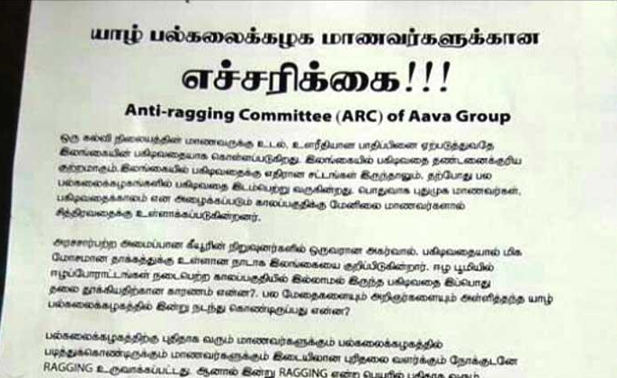 යාපනය විශ්ව විද්යාලයට තුළ නවක වදය ලබාදීම නවත්වන ලෙසත් නවක වධය ලබා දෙන්නවුන්ට දඬුවම් ලබාදෙන බවත් සඳහන් පෝස්ටර් කිහිපයක් ආවා කල්ලිය නමින් යාපනය විශ්ව විද්යාල භූමියේ අලවා ඇති බව වාර්තා වේ.