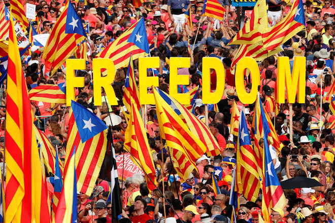 ස්පාඤ්ඤයෙන් වෙන්විය යුතු බවත් කැටලෝනියාවට දේශපාලන නිදහස හිමිවිය යුතු බවත් පවසමින් දශ ලක්ෂයකට ආසන්න පිරිසක් බාසිලෝනා නගරයේ ඊයේ දැවැන්ත විරෝධතා දක්වා ඇති බව විදෙස් මාධ්ය පවසයි.