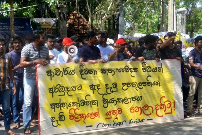 රජරට සරසවිය තුළ පැන නැගී ඇති ගැටලු විසදීම වෙනුවට වෛද්ය පීඨයත් අර්බුදයට යවමින් ආචාර්යවරුන්ගේ රදවා ගැනීමේ දීමනා අත්තනෝමතික ලෙස කප්පාදු කිරීමට උපකුලපතිවරයා විසින් කටයුතු සිදු කර ඇත. එම නිසා වෛද්ය පීඨ සියලුම දෙපාර්තමේන්තු ප්රධානින් තනතුරු වලින් මේ වන විට ඉල්ලා අස් වී ඇති අතර ගැටලු කඩිනමින් විසදීමට බල කරමින් සරසවිය ඉදිරිපිට මෙම විරෝධතාව පවත්වන ලදී.