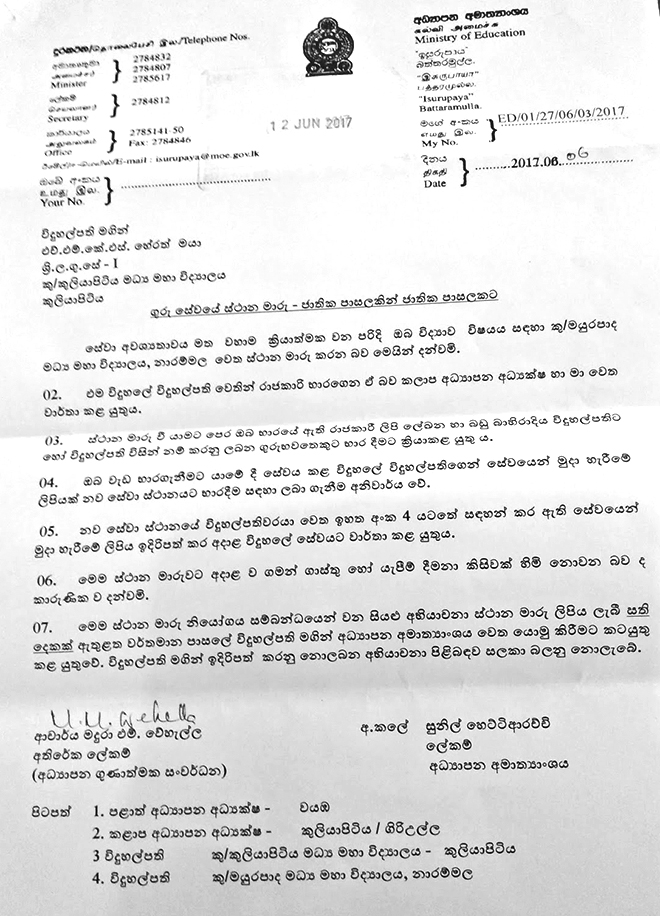 තරුණ ගුරුවරයා මෙම පළිගැනීමේ සිදුවීම නිසා මහත් පීඩාවකට ලක් විය. ඔහුගෙන් විදුහල්පතිවරයා කොතරම් පළිගත්තේද යත් අධ්යාපන අමාත්යාංශය විසින් ඔහු කුලියාපිටිය මධ්ය මහා විද්යාලයෙන් නාරම්මල මයුරපාද මධ්ය මහා විද්යාලයට දඬුවම් මාරුවකට ලක් කර තිබේ. අධ්යාපන ඇමති අකිල විරාජ් සමග විදුහල්පති සමීපව ගනුදෙනු කරන බවද කියැවේ. පාසලේ ගුරුවරුන් විසින් මෙම තත්වයපිළිබද අධයාපන බලධාරින්ට මෙන්ම පොලිසියටද පැමිනිලි කර තිබිණි. අධ්යාපන අමාත්යාංශයේ වංචා විමර්ශන ඒකකයේ නිලධාරීන් පසුගිය ජනවාරි 23 වැනි දින හදිසියේ කුලියාපිටිය මධ්ය මහා විද්යාලයට පැමිණ එම ගුරුවරයාගෙන් කවි ලිවීම හා ඒවා ප්රසිද්ධ කිරීම සම්බන්ධයෙන් ප්රශ්න කර තිබුණි. ගුරුවරයකුව සිටිමින් කවි ලිවීම නිසා කුලියාපිටිය මධ්ය මහා විද්යාලයටත් අධ්යාපන අමාත්යාංශයටත් අපහාසයක් වන බවට විමර්ශකයන් විසින් ගුරුවරයාට චෝදනා කර ඇත. එසේම කවි ලිවීමෙන් “ගුරු භවතුන් හෝ සිසු දරුවන් උසි ගන්වනවාද” යනුවෙන්ද එම විමර්ශන කණ්ඩායම ඔහුගෙන් ප්රශ්න කර තිබුණි.