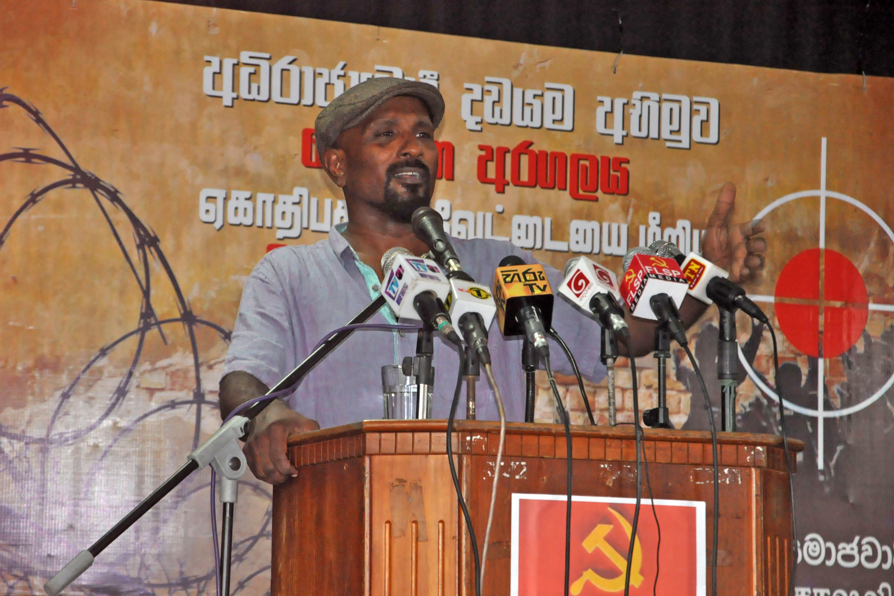 “අදත් රාජපක්ෂ වටේ ඉන්න බලවේග තුළ ඇත්තටම අධිරාජ්ය විරෝධයක් තියෙනවද? අධිරාජ්යවාදය විසින් ඉදිරිපත් කරන වැඩපිළිවෙළට මේ අයගෙන් විරෝධයක් නෑ. පවතින රනිල් මෛත්රි ආණ්ඩුව වගේම ඔවුන් කටයුතු කරන්නෙත් ජාත්යන්තර මුල්ය අරමුදල සහ ලෝක බැංකුව දෙන වට්ටෝරුව අනුවයි. 2005 සිට පැවති රාජපක්ෂ පාලනය ඊට හොදම උදාහරණයක්. ඉතින් මේ අය ව්යාජ අධිරාජ්ය විරෝධයක් ගෙන යන්නෙ. මේ ආකාරයට තමන් තෝරාගත් කදවුරට එරෙහිව පමණක් සටන් පාඨ ගැනීම නිසා ඔවුන් හරහා නිර්මානය වෙන්නෙ ජාතිකවාදය සහ ජාතිවාදය….“