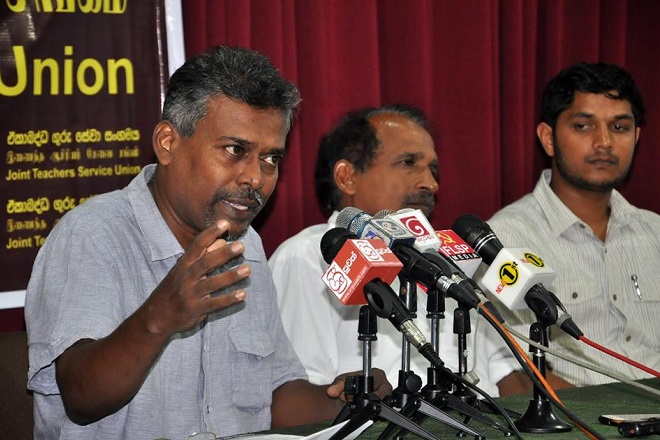 ආණ්ඩුව හිතමතාම ගුරු විදුහල් ස්වාභාවික මරණයකට යවමින් ඉන්නවා. ඊට අවශ්ය යෝජනා 2017 අයවැයට අන්තර්ගත කර තිබුණා. සැබෑ ගුරු හිඟයක් තිබෙනවා. ඒකට පිළියම් යොදනවා වෙනුවට, ඒ ගුරු හිඟය අධිනිශ්චය කර ගුරු අධ්යාපනය මුදලාලිකරණය කරන්න පියවර ගෙන තිබෙනවා. උසස් පෙළ සමත් දරුවන්ට රුපියල් ලක්ෂ පහක ණය මුදලක් දීලා ගුරු අධ්යාපනය පෞද්ගලික අංශයට දීලා, ගුරු විදුහල් අහෝසි කරන්න කටයුතු කරමින් ඉන්නවා. නවීන දැනුමෙන් පොහොසත් ගුරු අධ්යාපන ක්රියාවලියක් සකසන්න කියා ඒකාබද්ධ ගුරුසේවා සංගමය ලෙස අපි රජයට බල කරනවා.