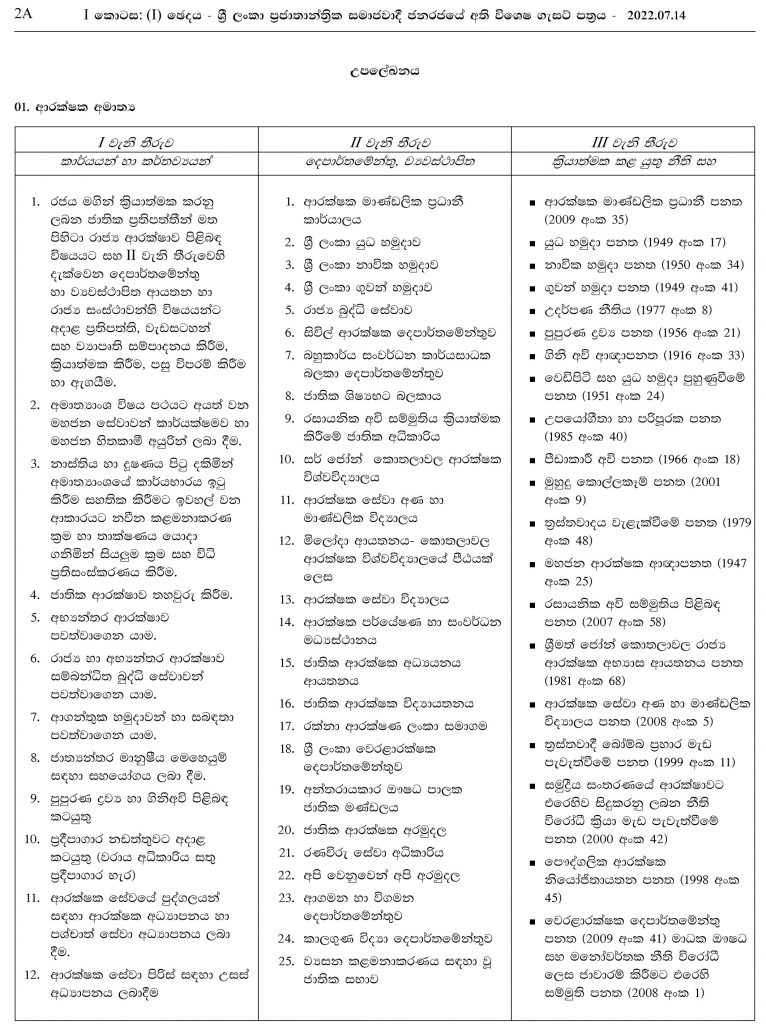 රාජ්ය ආයතන 42ක් ආරක්ෂක අමාත්යංශය යටතට පවරමින් වැඩබලන ජනාධිපති රනිල් වික්රමසිංහ විසින් ඊයේ (ජූලි 14) සිට බල පැවැත්වෙන පරිදි අතිවිශේෂ ගැසට් නිවේදනයක් නිකුත් කරනු කර ඇත. මෙම අතිවිශේෂ ගැසට් පත්රහ මගින් පෞද්ගලික ආරක්ෂක සේවා සම්බන්ධ කටයුතු, පුද්ගලයන් ලියාපදිංචි කිරීමේ දෙපාර්තමේන්තුව, කොළඹ වරාය නගරය, ආර්ථික කොමිෂන් සභාව, මහ කොළඹ ආර්ථික කොමිෂන් සභාව, රණවිරු සේවා අධිකාරිය, රක්නා ආරක්ෂක ලංකා සමාගම ඇතුළු ආයතන 42ක් ආරක්ෂක අමාත්යංශය යටතට පත්කර ඇත.